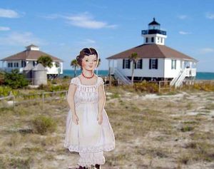 Hitty Preble and I visited the lighthouse at Boca Grande, FL. We had lunch first on the picnic tables nearby, then walked the boardwalk over the dunes to the beach on the Gulf of Mexico. There was a good view of the lighthouse. The beach was nearly deserted. Hitty wished she had a bathing suit, it would have to be an old fashioned one to cover all her underwear!